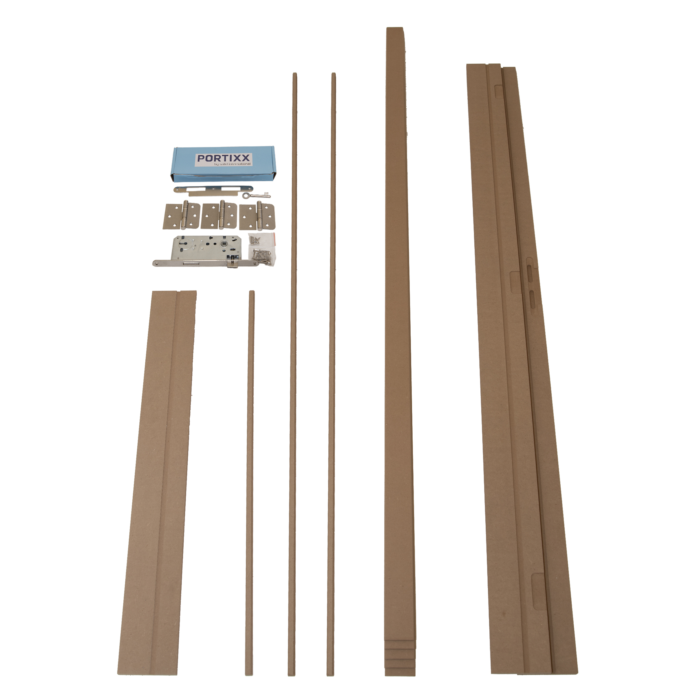 The Portixx unfinished MDF door set consists of a door frame, battens, architraves, and door hardware.