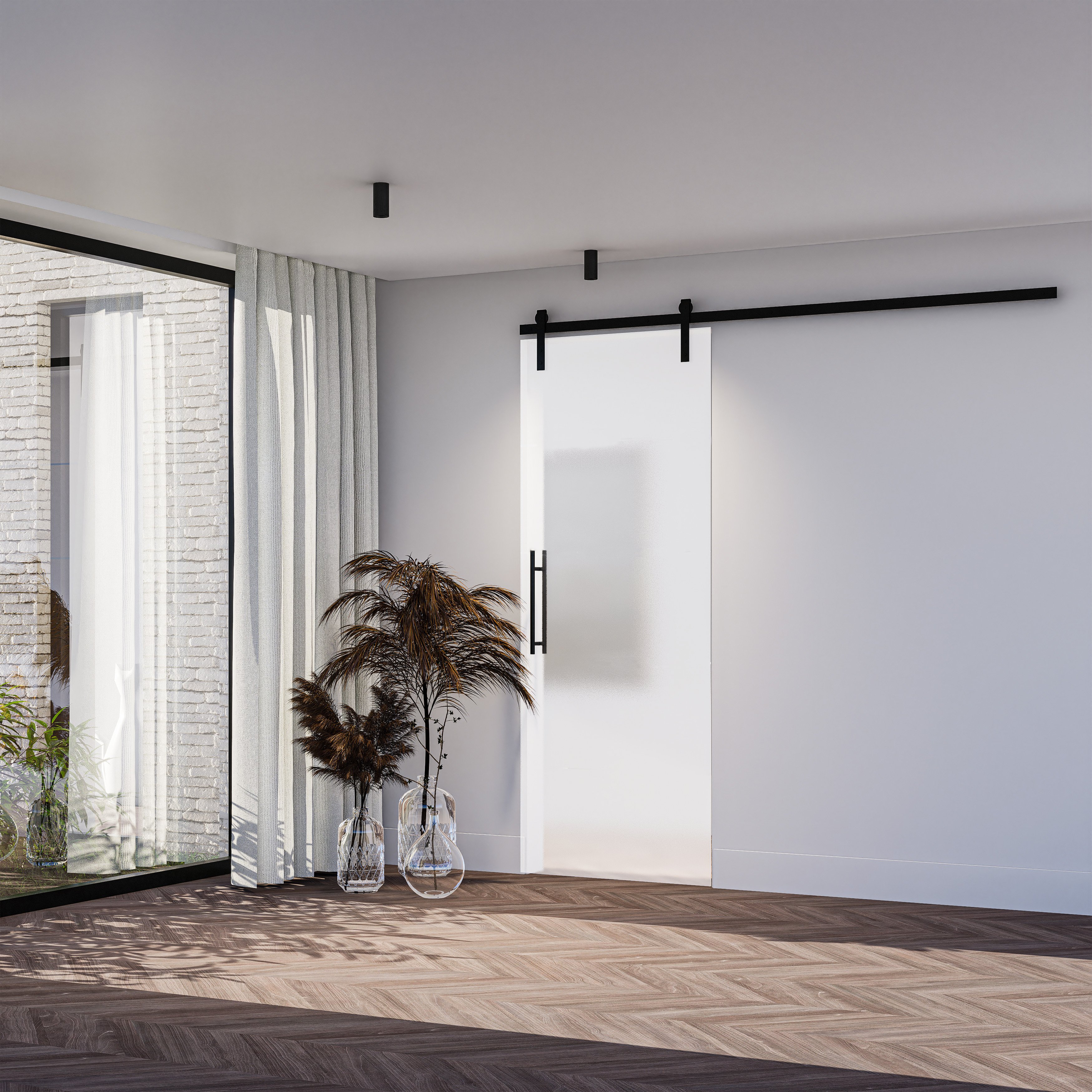 Deze schuifwand uit glas wordt zonder slot geleverd. Het schuifdeursysteem en de deurtrekker zijn eveneens apart bij te bestellen.
