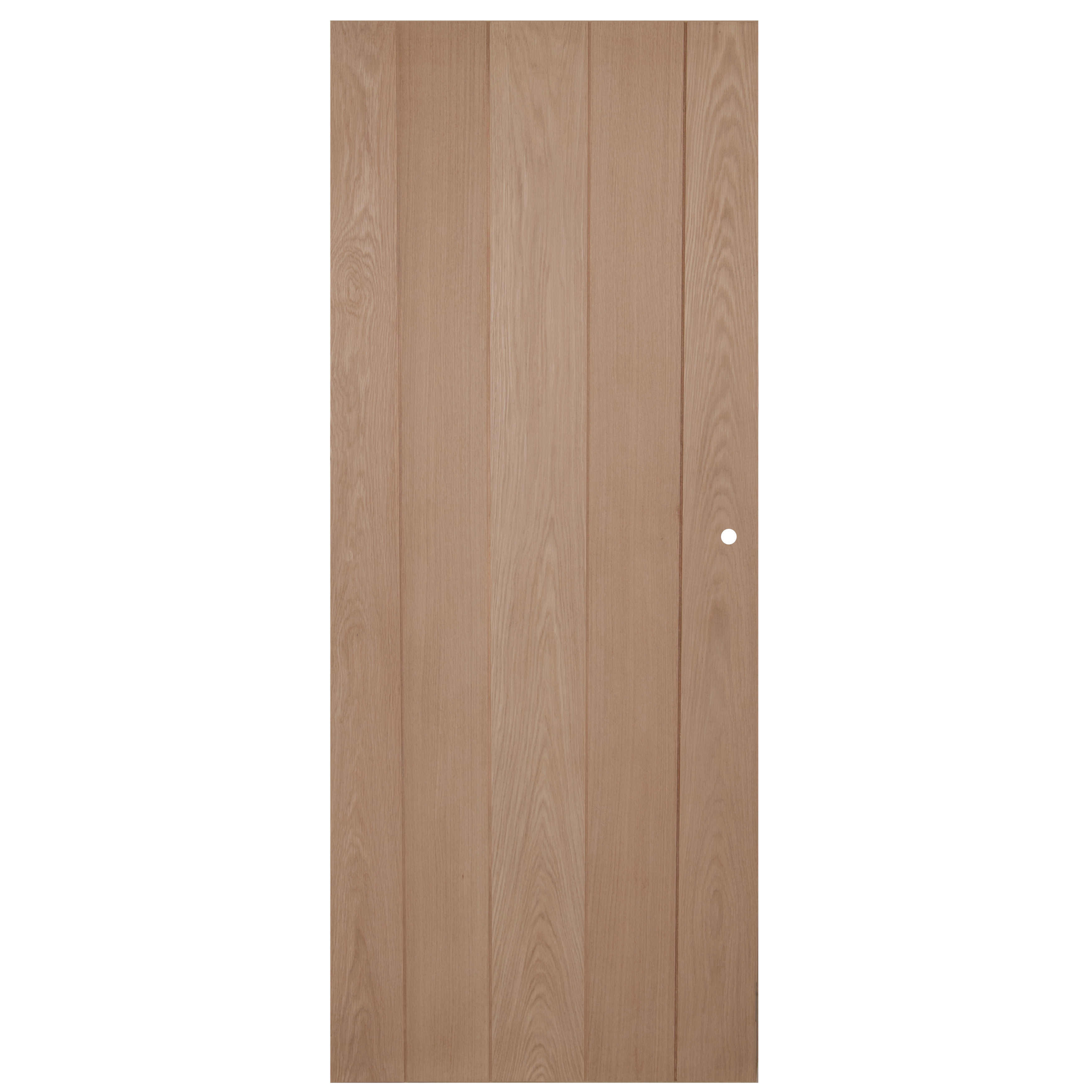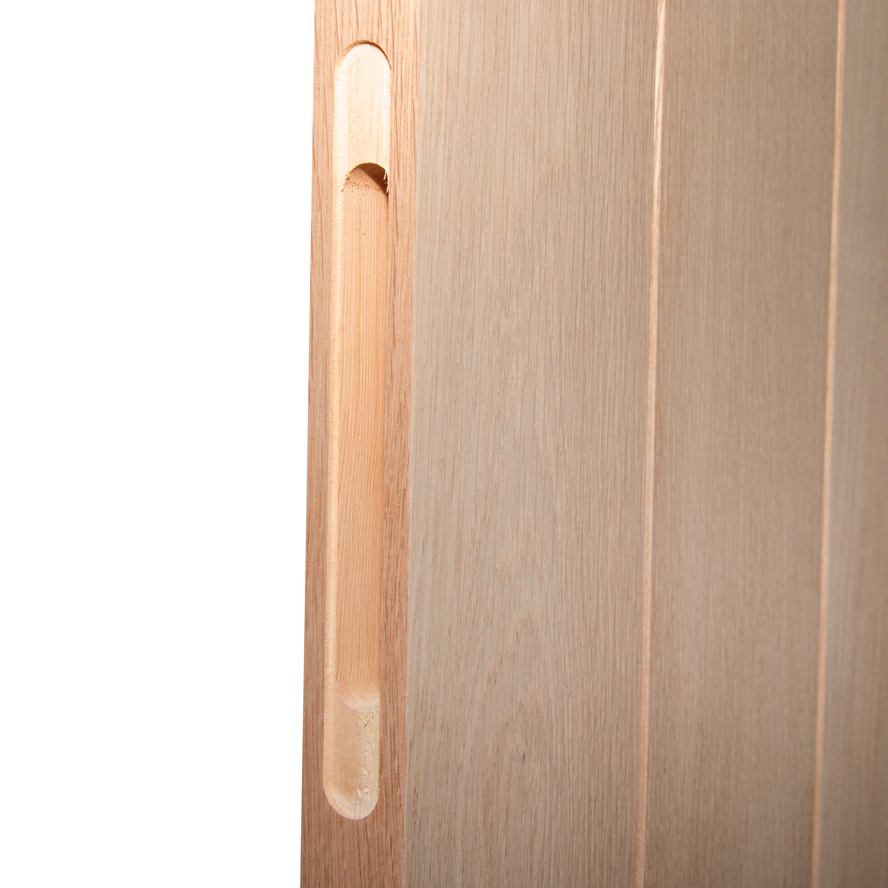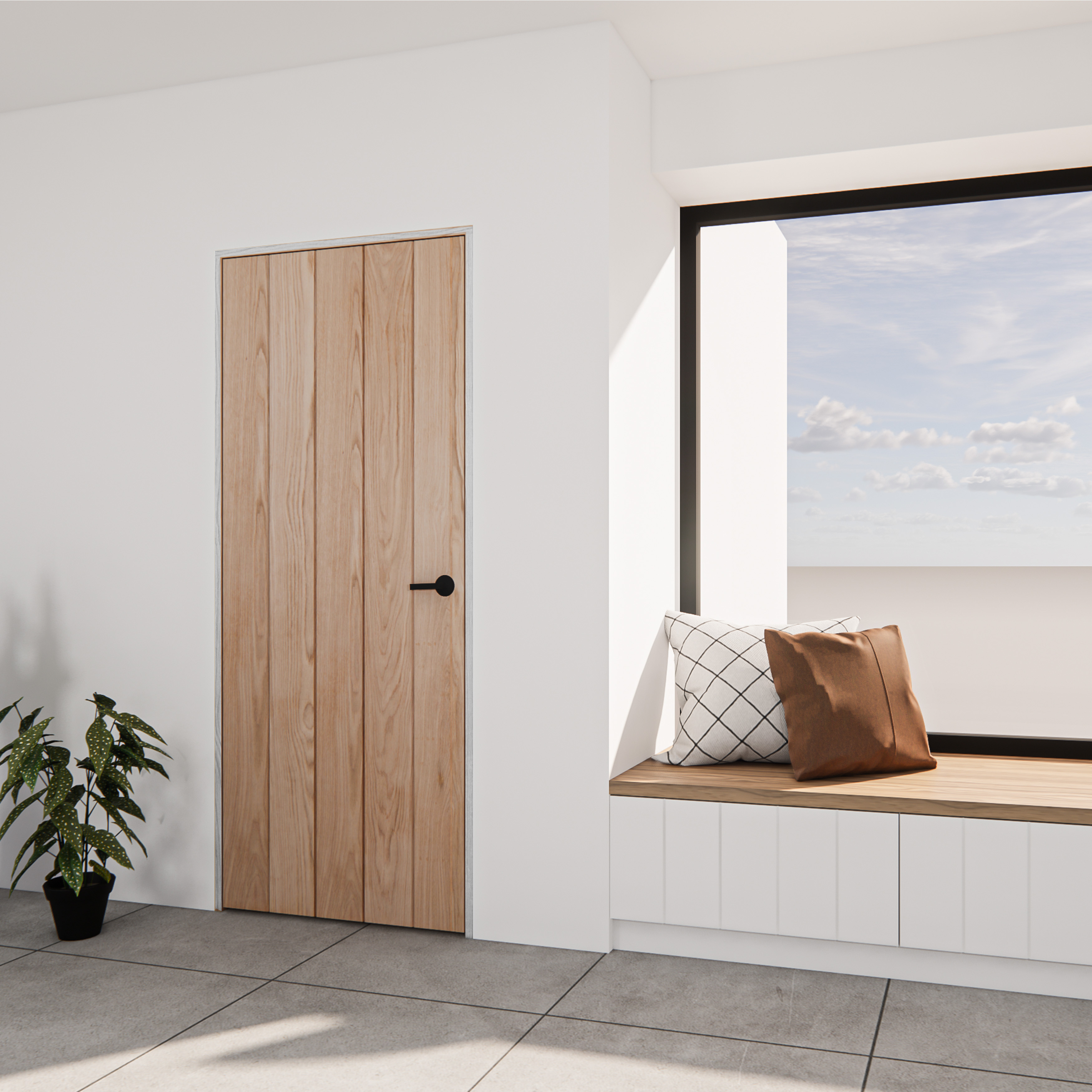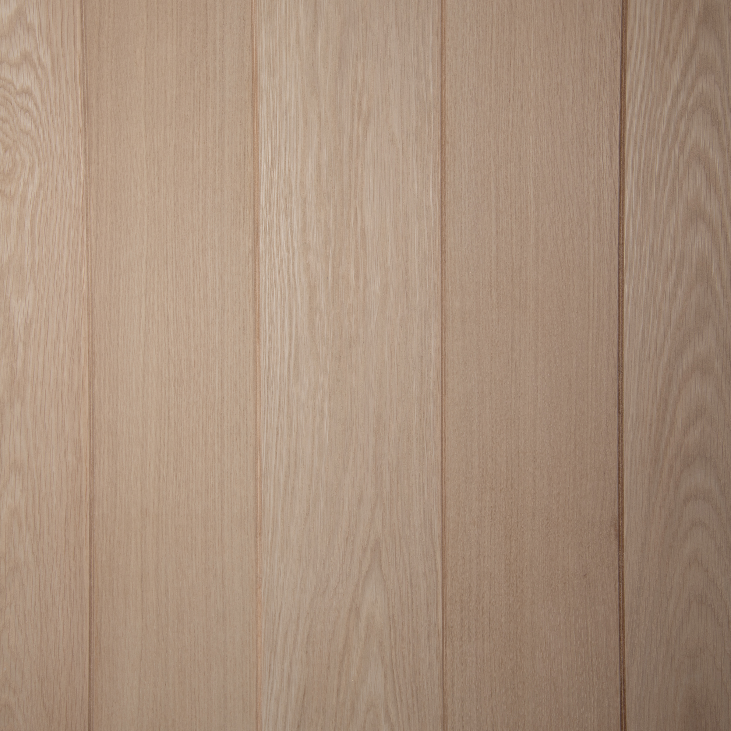 De MDF panelen van 5 mm zijn overgefineerd in 0,6 mm eik. De panelen bevatten decoratieve verticale lijnen met ingelegde massieve eiken latten. Bij het produceren van deze eiken binnendeur wordt op de gemaakte deur een laag fineer van 6 mm geplaatst. Eens de fineer op de deur ligt, worden de lijnen ingefreesd. Vervolgens wordt een massieve eiken lat in de ingefreesde lijnen ingelijmd.