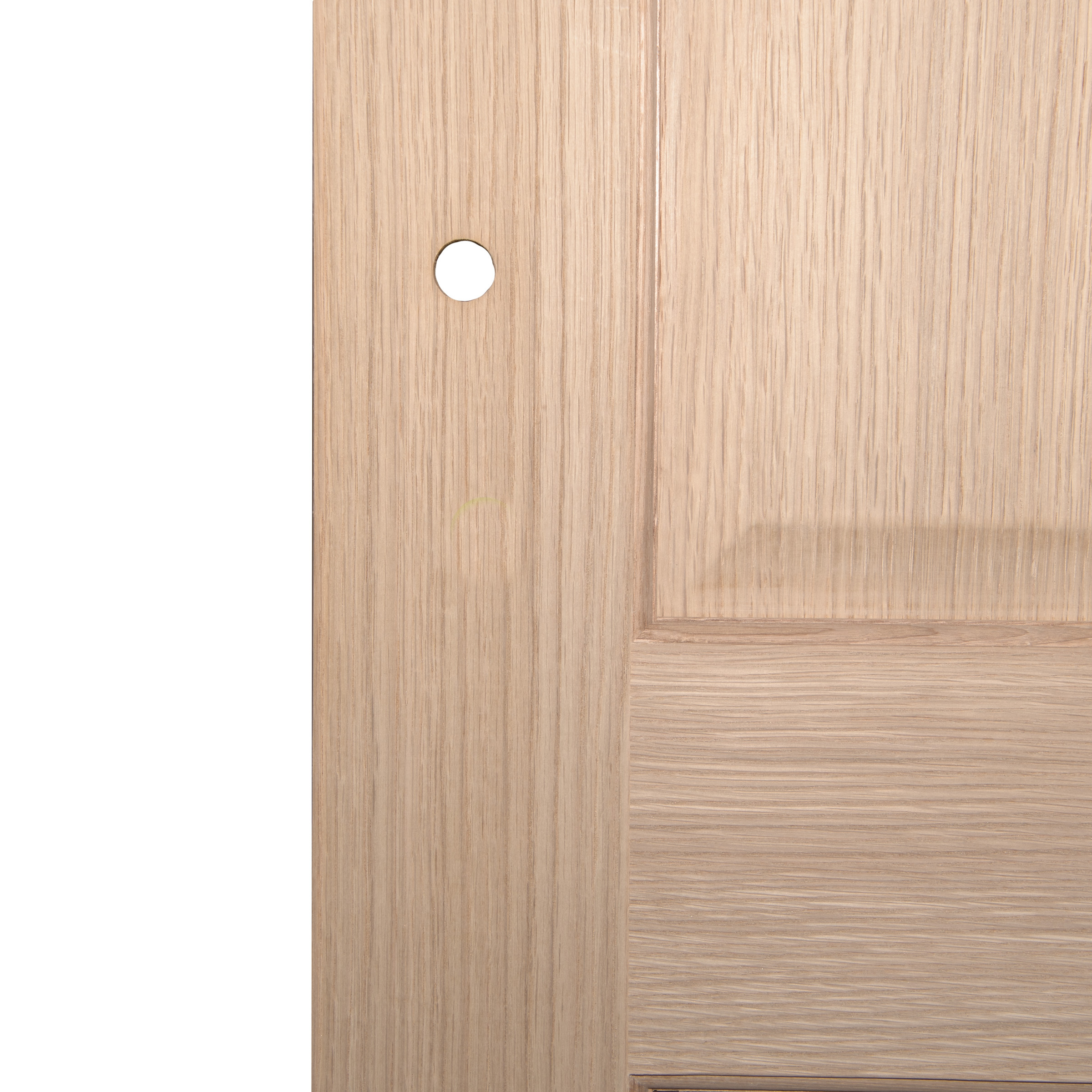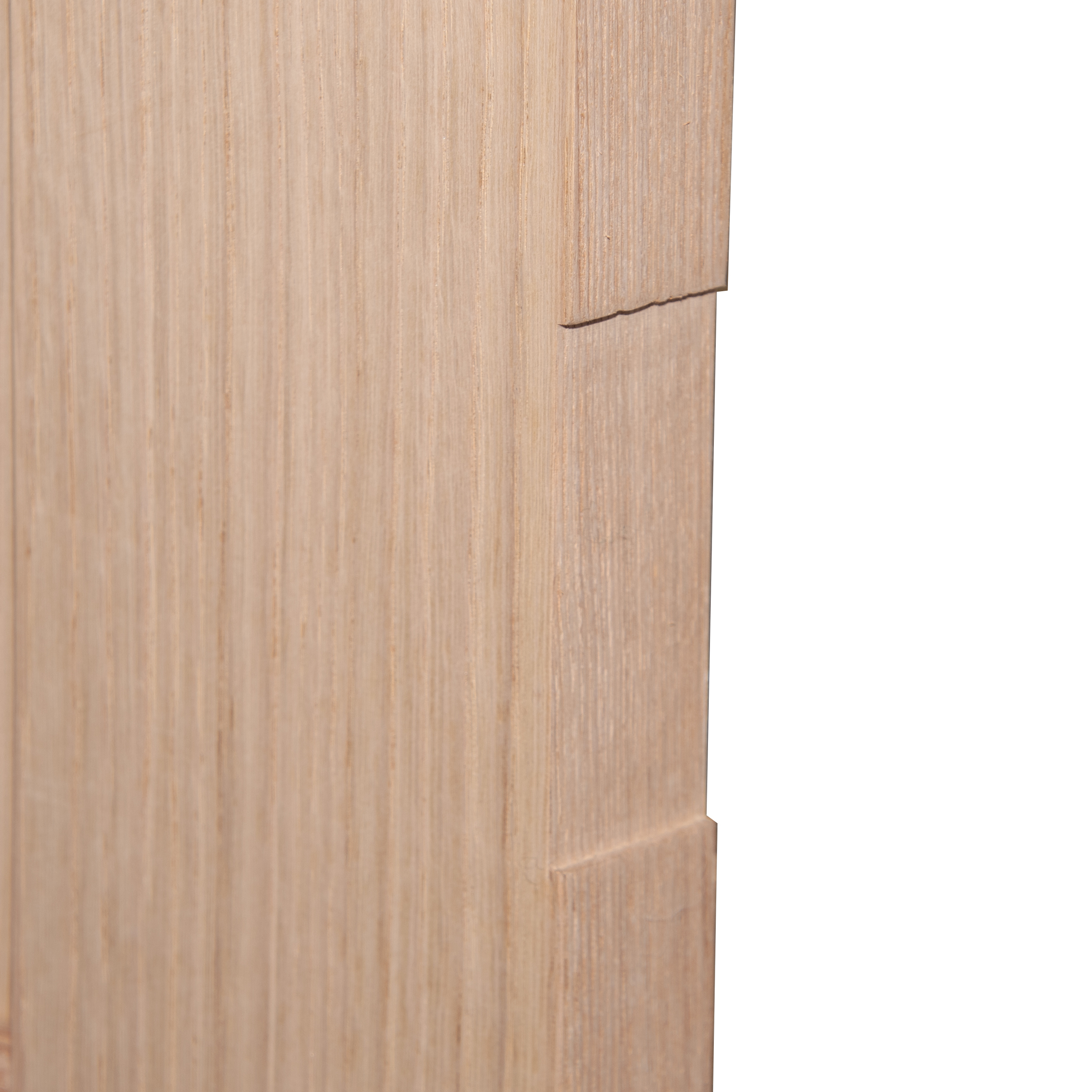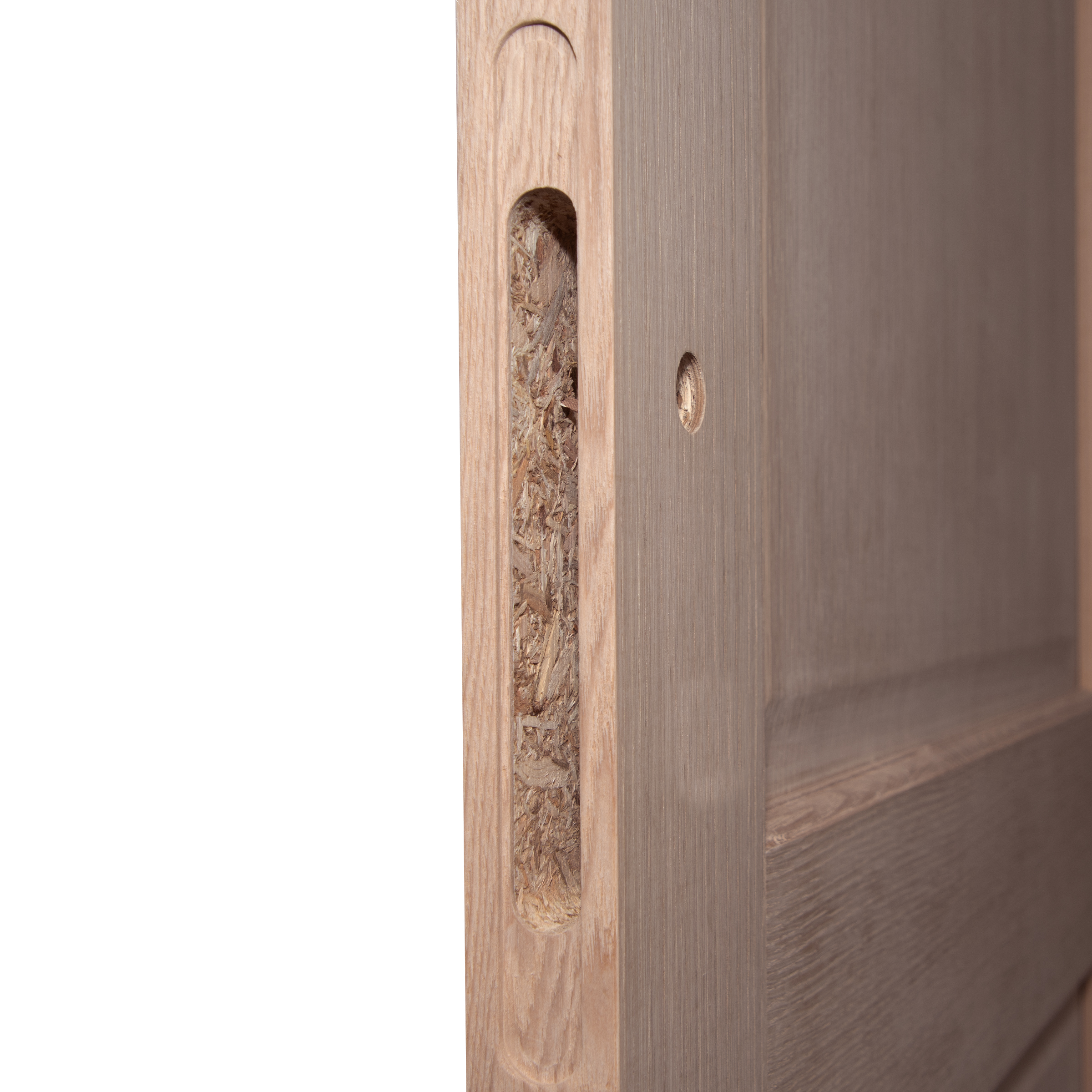 De kern van de eiken Moulura binnendeuren is een combinatie van spaanderplaat, massief eik en eik fineer. Het deurblad is voorzien van een rechte gravering in het deurblad, wat een elegante uitstraling geeft. De deur moet nog behandeld worden met olie om de natuurlijke schoonheid van het hout te behouden en te beschermen.
